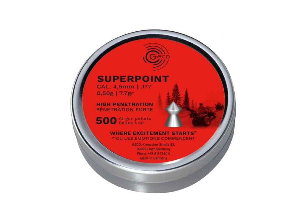 Geco Superpoint je vzduchovka s hladkým okrajom a kužeľovitou špičkou pre vysoký úder a hlboký prienik. Je vhodná na streľbu na siluetu, ako aj na ničenie malých škodcov. Optimálne ťažisko zaisťuje dobrú presnosť za priaznivú cenu.
